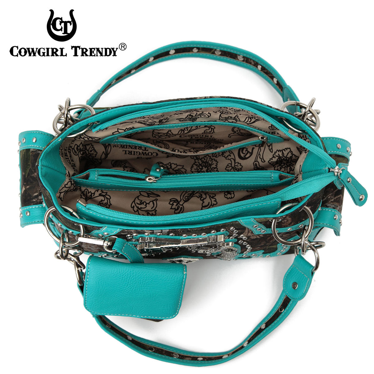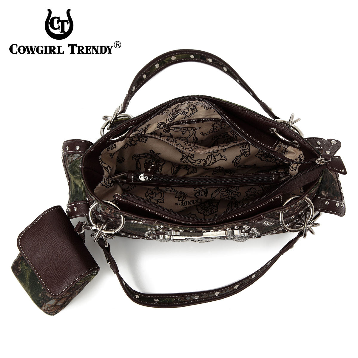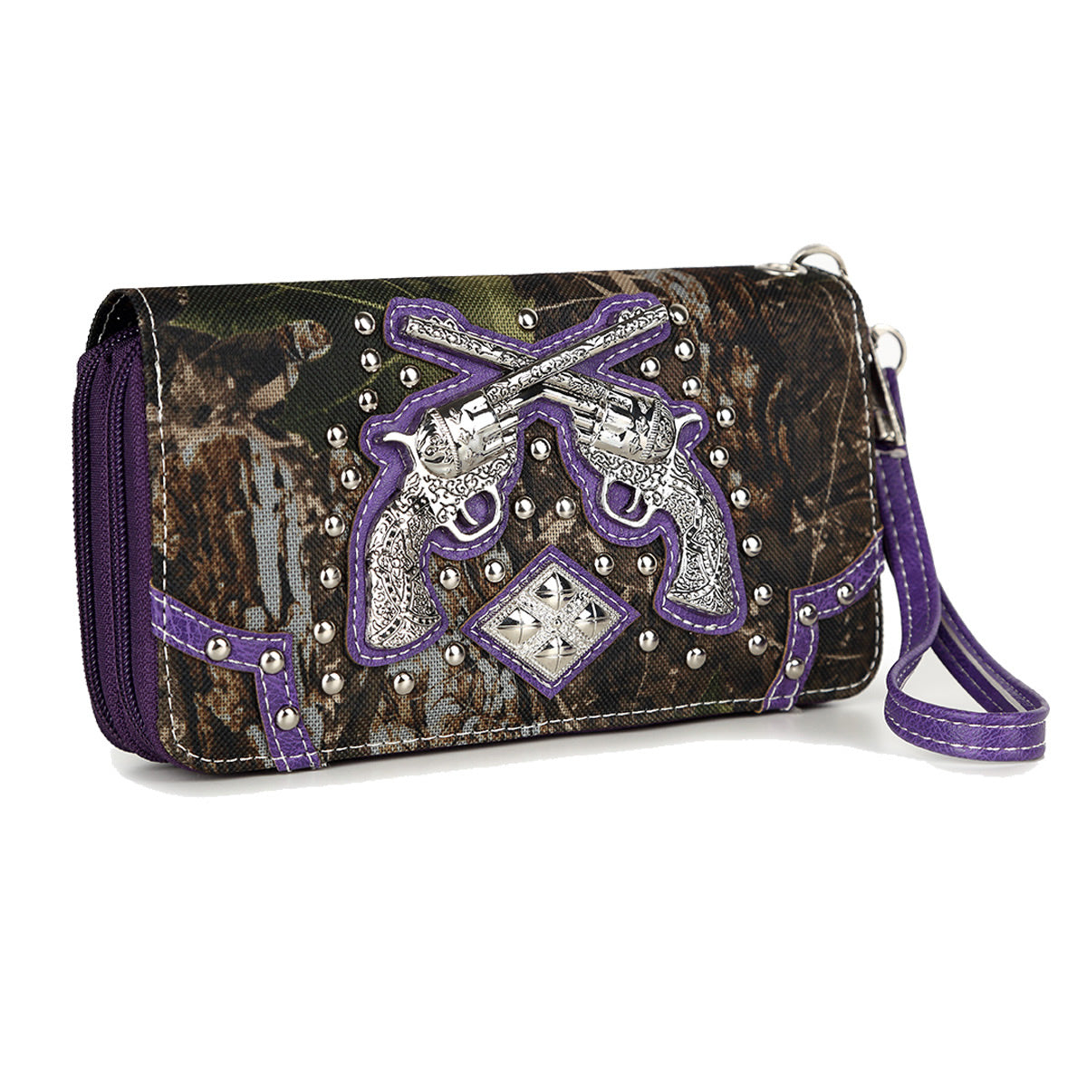Backside: Open Back Phone Pocket, Concealed carry pocket ( 8'' X 6.5'') with zipper closure. Wallet: Matching continental wallet double zippered with Removable wristlet strap