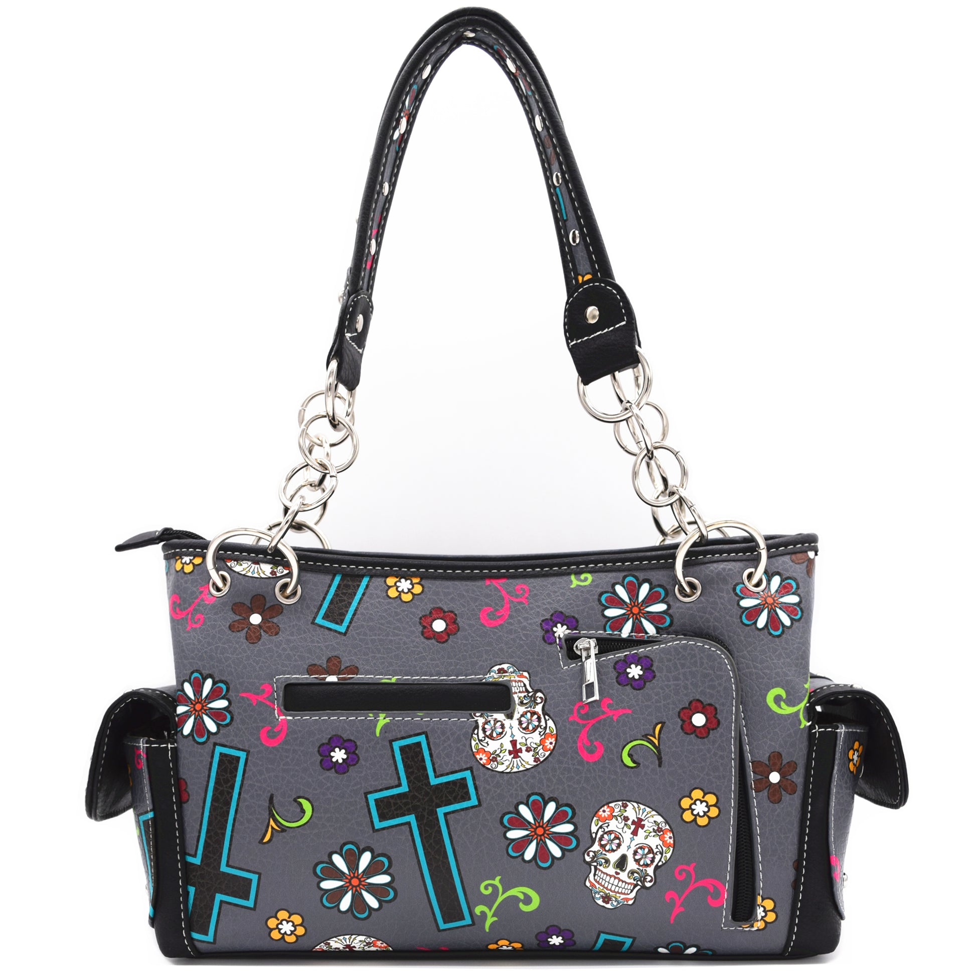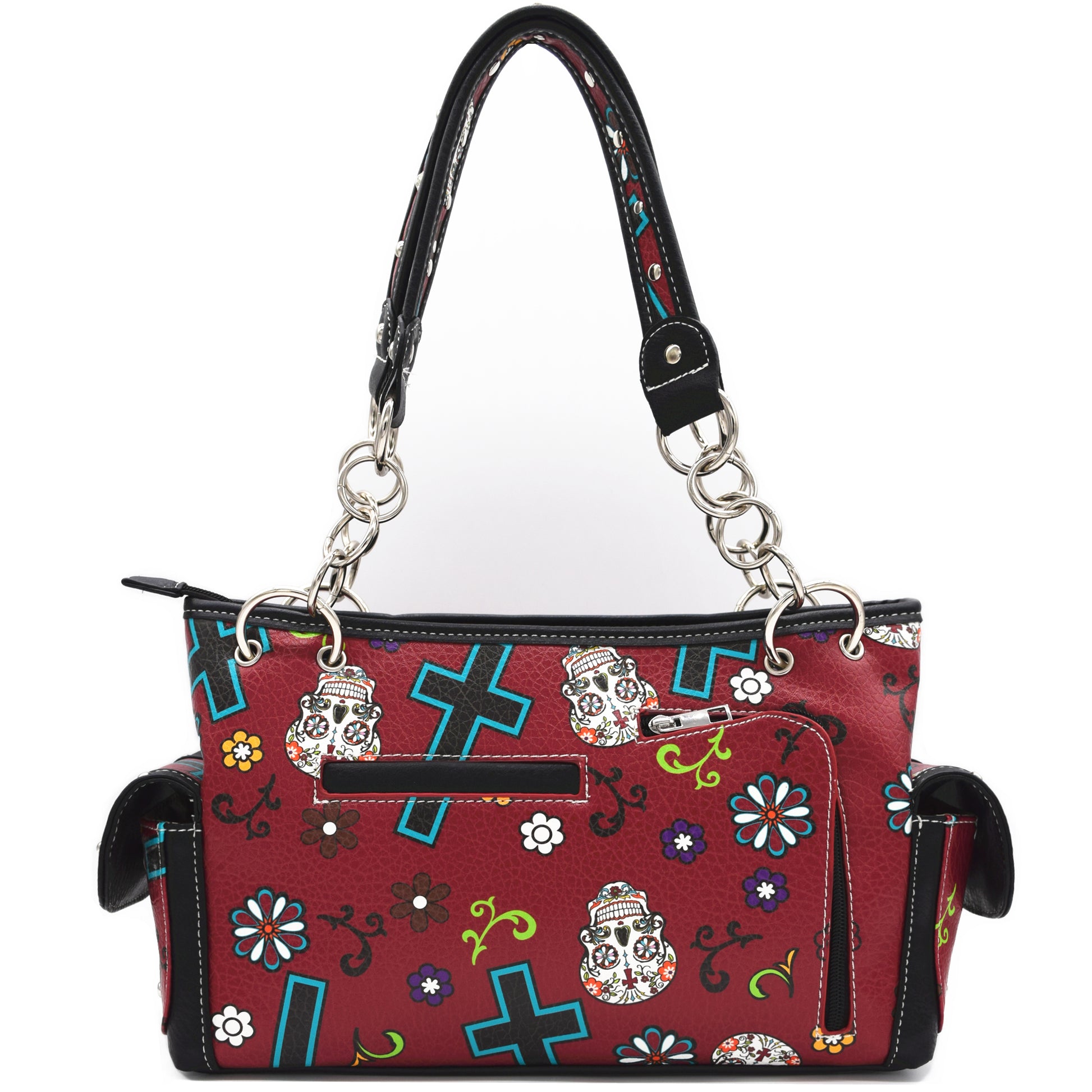 Proudly Designed in the United States | Two Magnetic Closure Pockets On Side | Silver-tone hardware | Zip Top Closure | Strap length 21 inch | Drop length 10.5 inch |