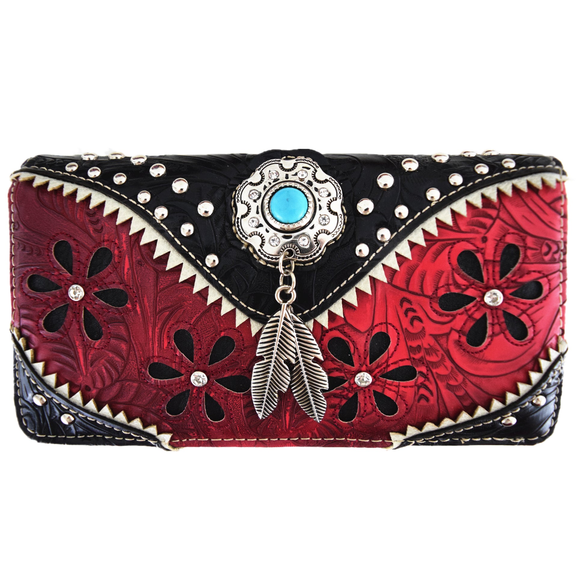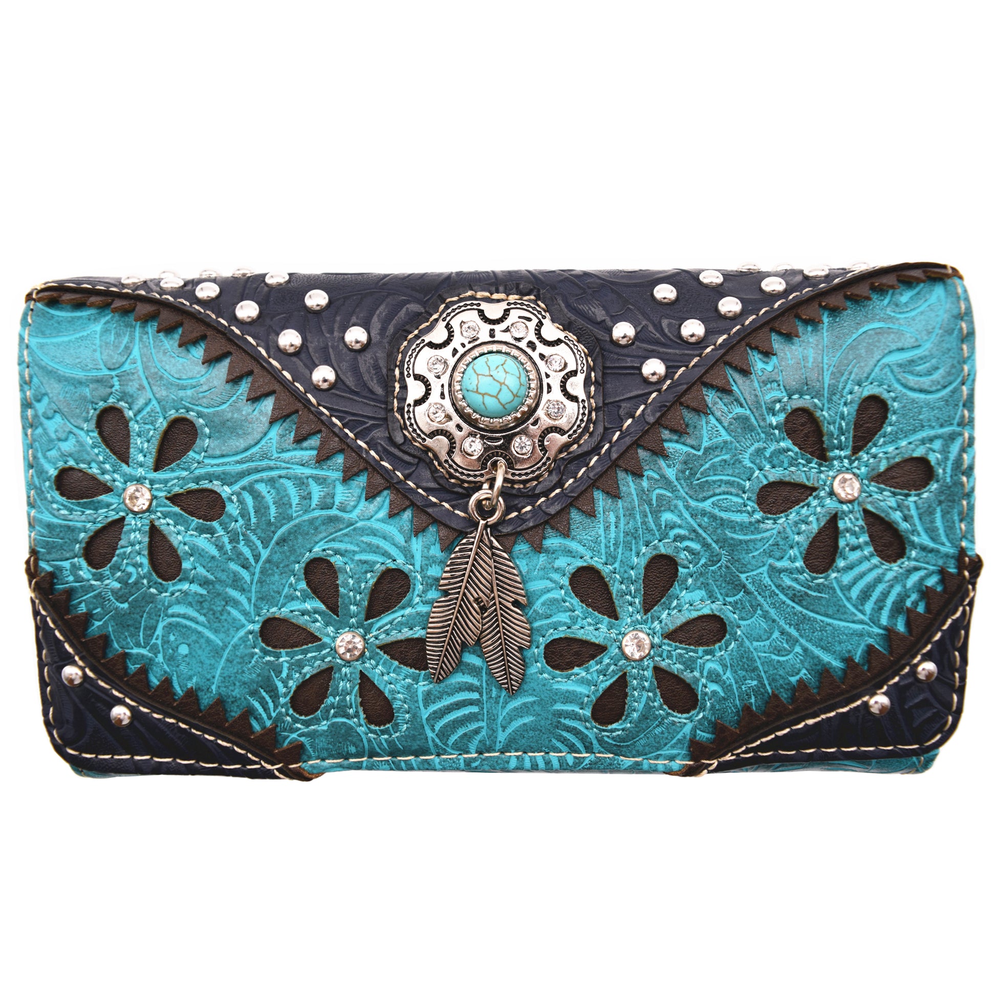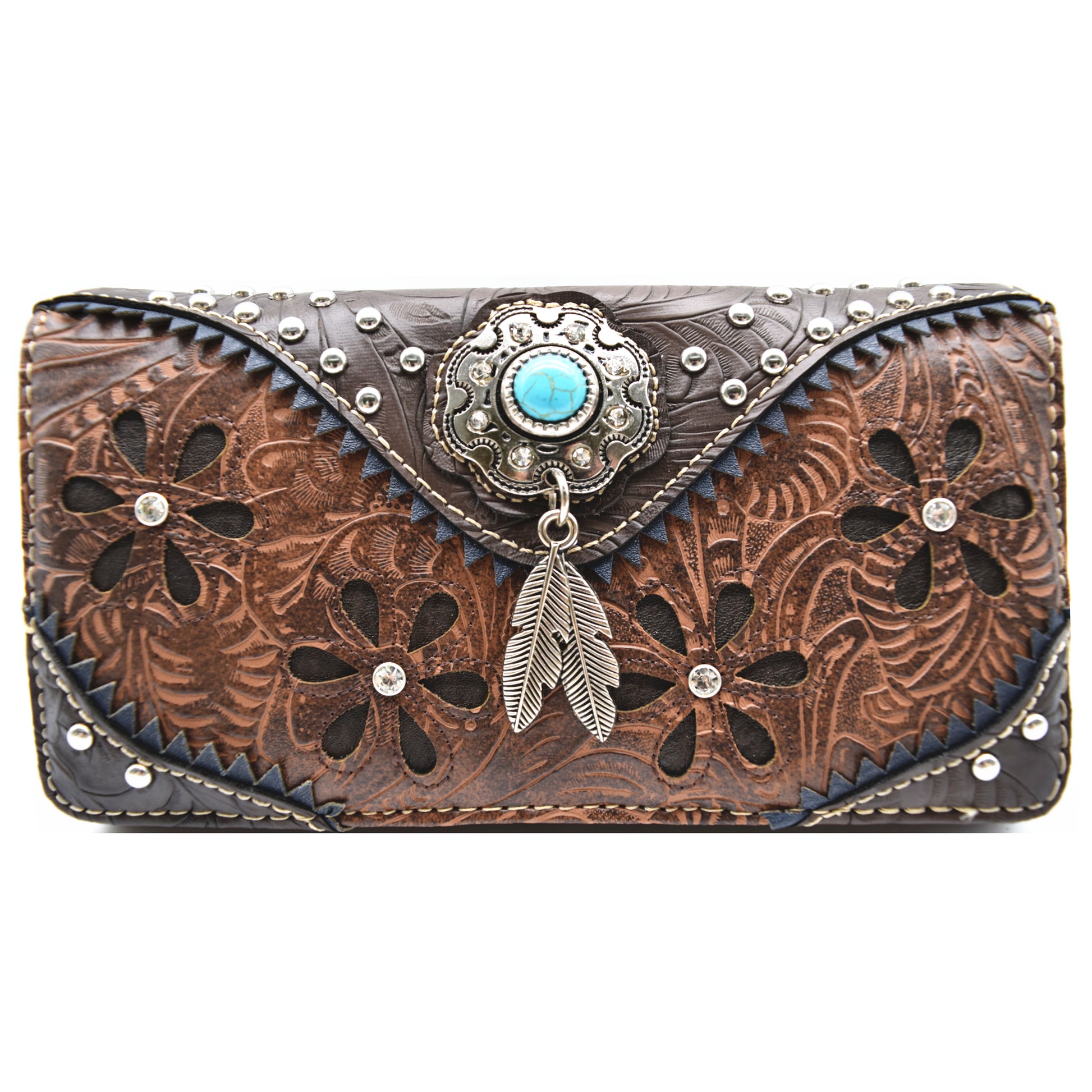 Western Style Feather Tooled Leather Floral Laser Cut Flower Women Trifold Wallet